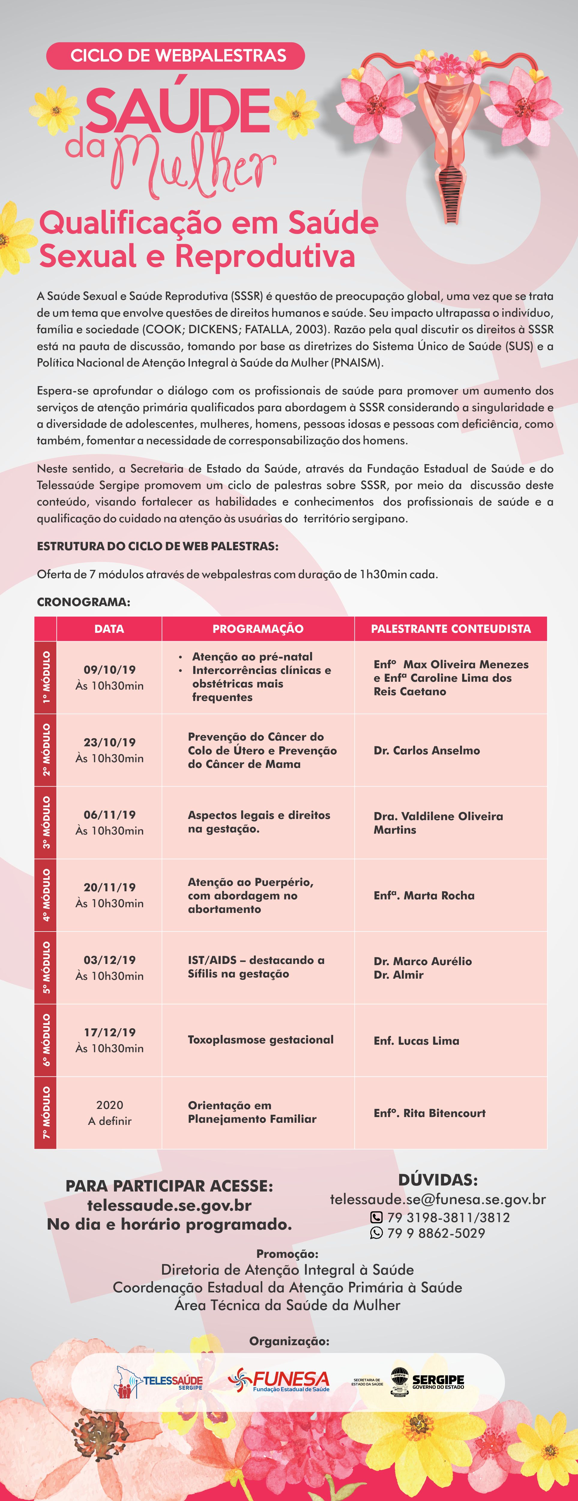 Neste sentido, a Secretaria de Estado da Saúde, através da Fundação Estadual de Saúde e do Telessaúde Sergipe promovem um ciclo de palestras sobre SSSR, por meio da discussão deste conteúdo, visando fortalecer as habilidades e conhecimentos dos profissionais de saúde e a qualificação do cuidado na atenção às usuárias do território sergipano.