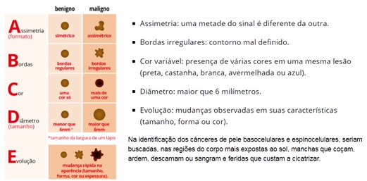 O câncer de pele não-melanoma ocorre principalmente em áreas do corpo mais expostas ao sol, como rosto, pescoço e orelhas, podendo destruir estas estruturas. Apresenta-se como: (a) manchas na pele que coçam, ardem, descamam, sangram; (b) feridas que não cicatrizam em até 4 semanas. Na figura abaixo, que mostra o Teste ABCDE, pode-se observar algumas características das lesões na pele.